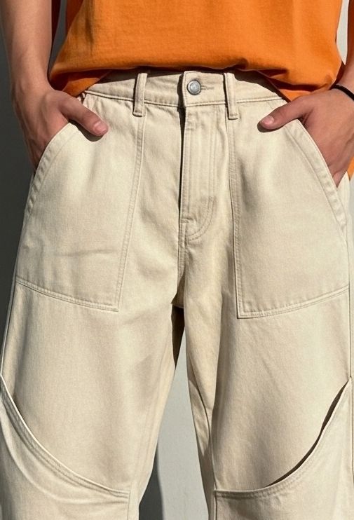 Experience the perfect blend of comfort and style with the Beige Patchline Jeans. Designed with a relaxed, baggy fit, these jeans offer freedom of movement and a trendy silhouette. Unique cross front patch pockets near the knee and a distinctive back patch pocket add both visual interest and functionality. Ideal for those seeking standout denim that doesn’t compromise on ease, these jeans elevate your casual wardrobe effortlessly.
