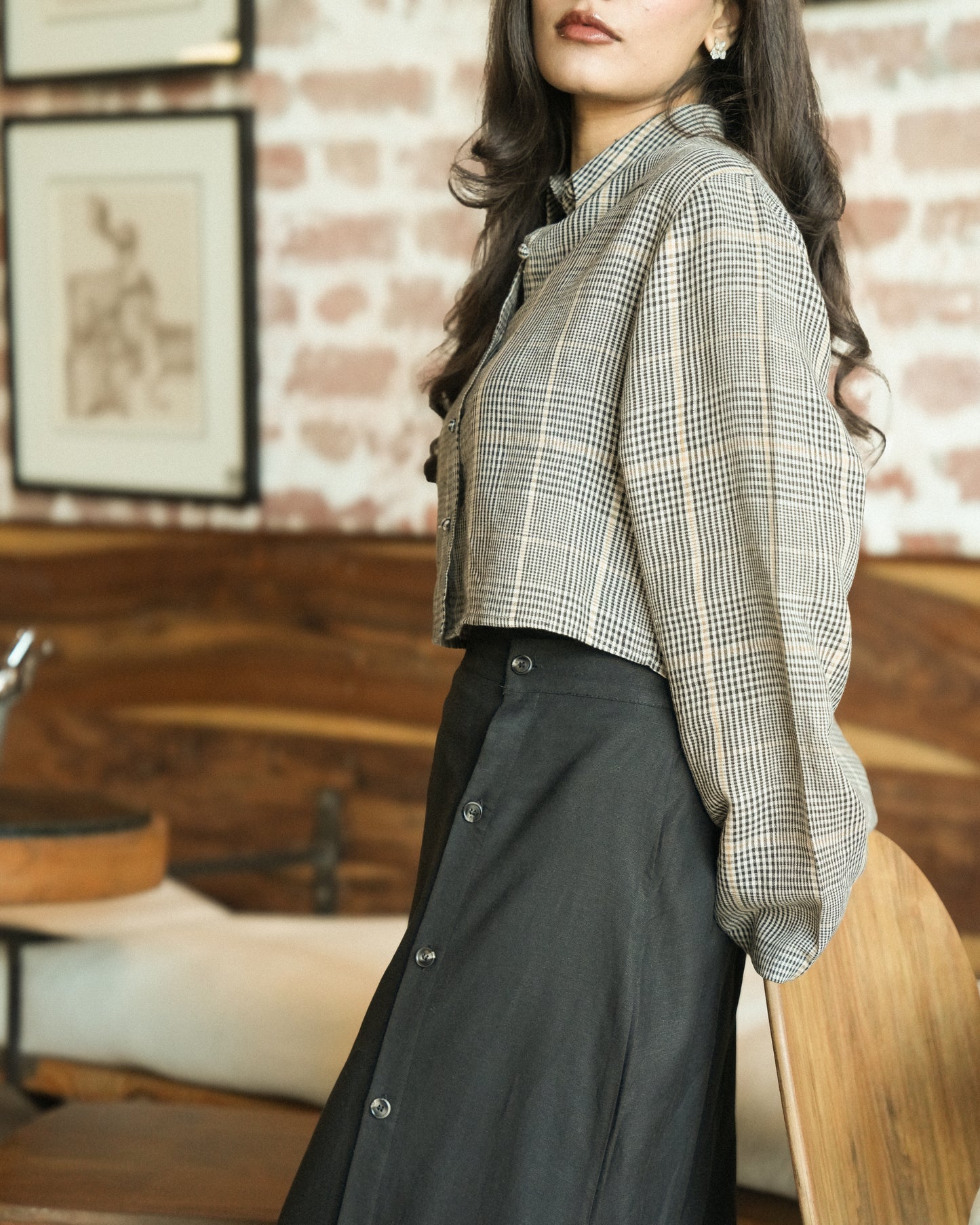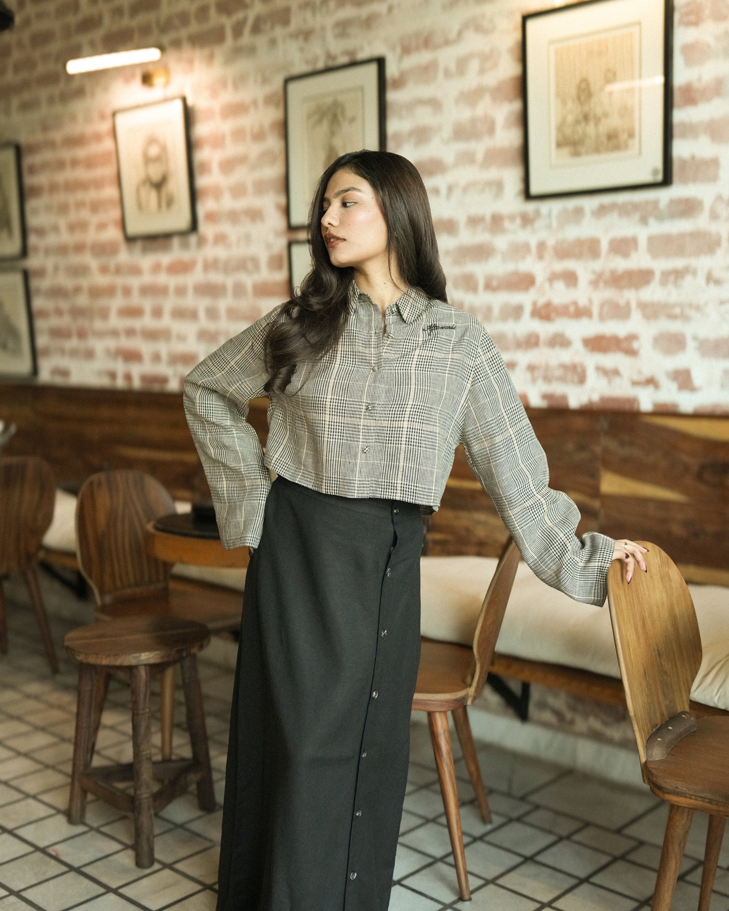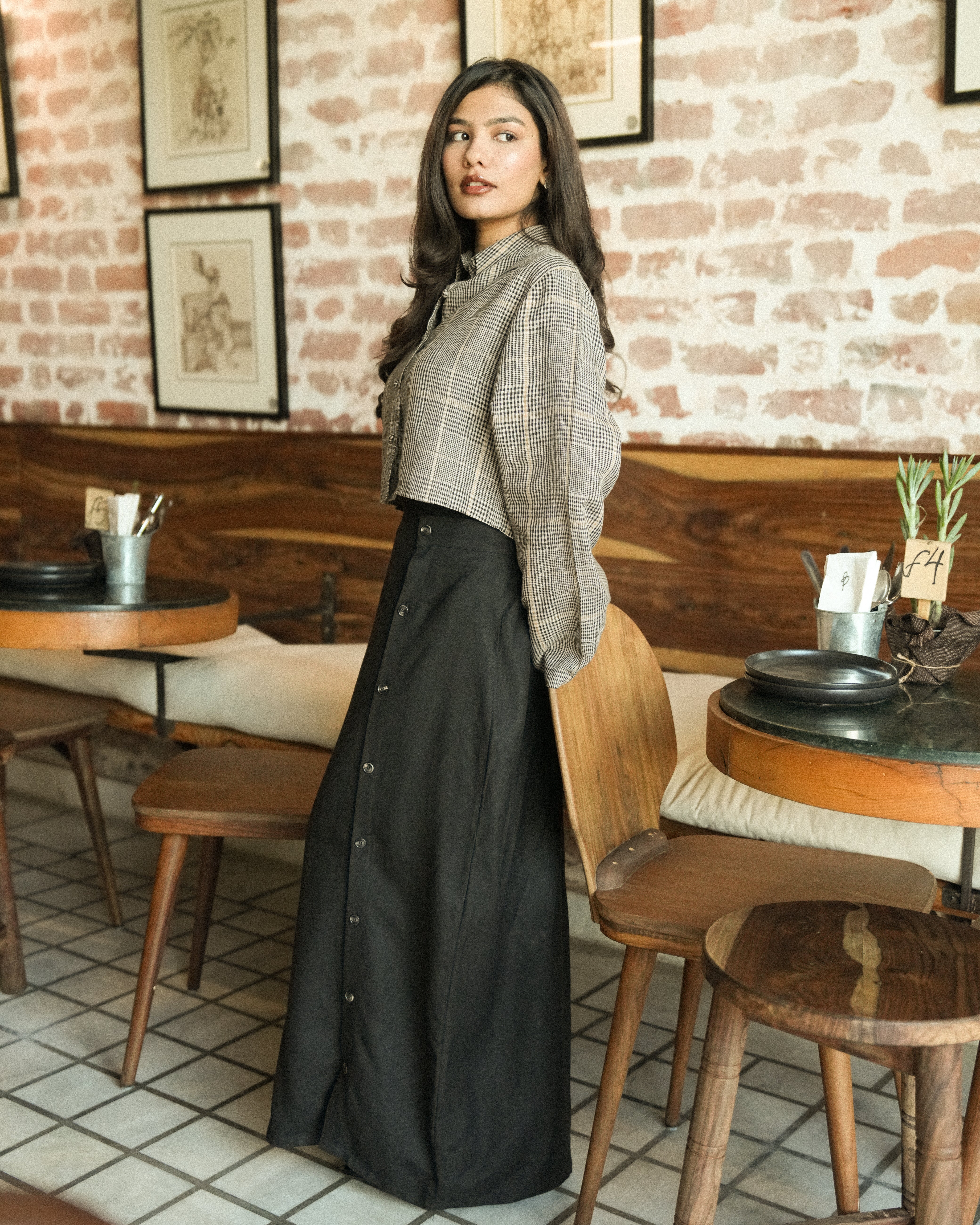 A two-piece set of skirt & kimono style top + Material: pinstripe linen fabric with wool blend + Top is adjustable from the chest to torso area with string mechanism on the side + Skirt waistband is secured with a hook & zip with elastic on the back for up to 2 inches of stretch + Skirt has a back slit to provide ease in movement + Skirt has medium depth pockets