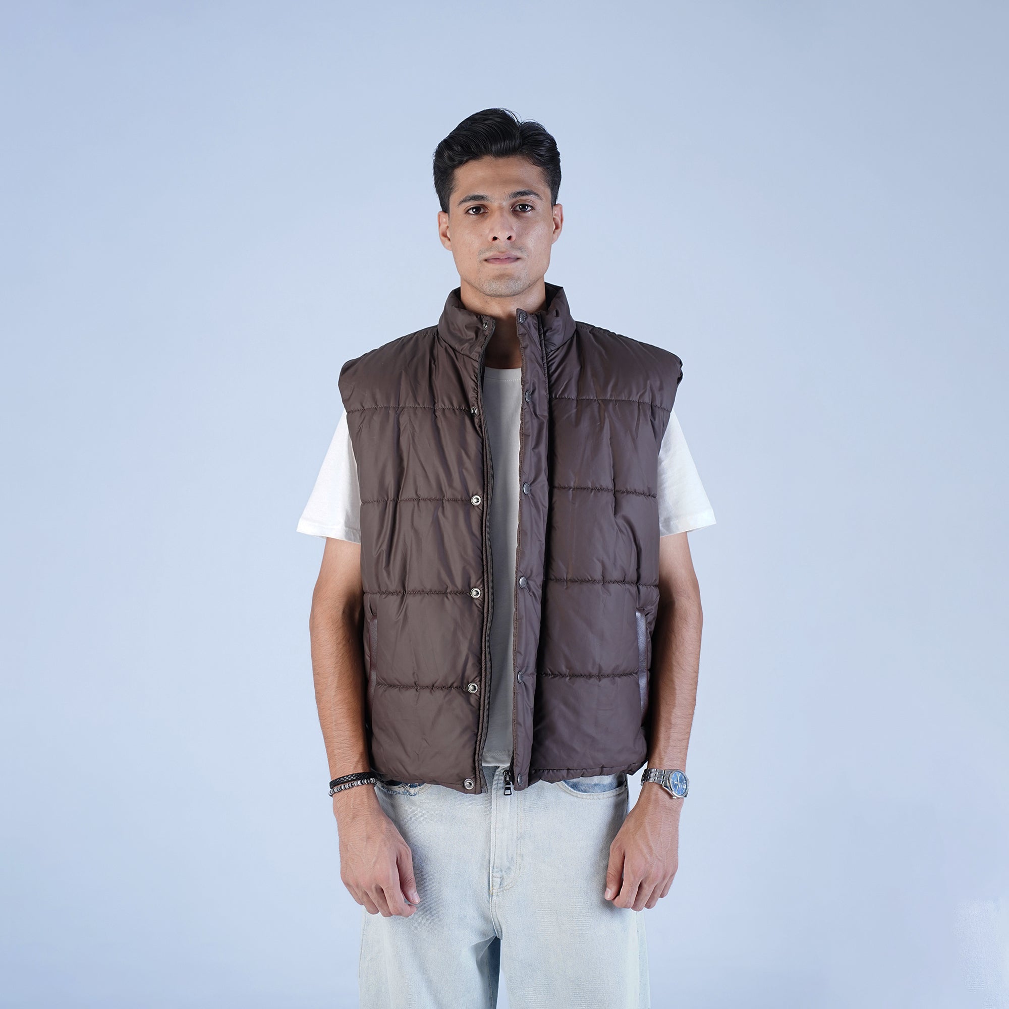 Men's Brown Sleeveless Puffer Jacket. Dual closure-zip & buttons. Finished with premium leather placement over pocket. Detailing that elevates it beyond the ordinary. For those who choose craftmanship over compromise!