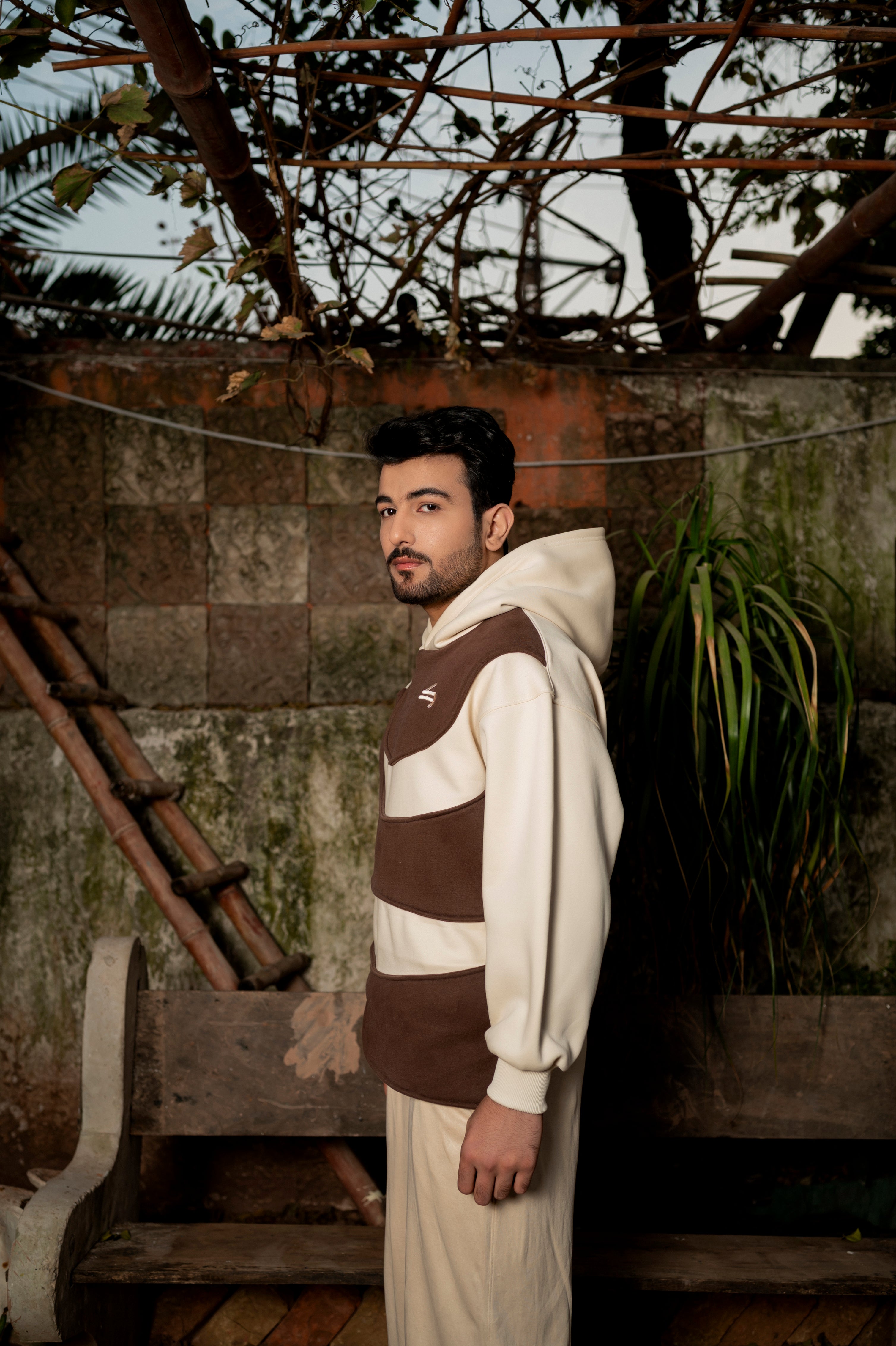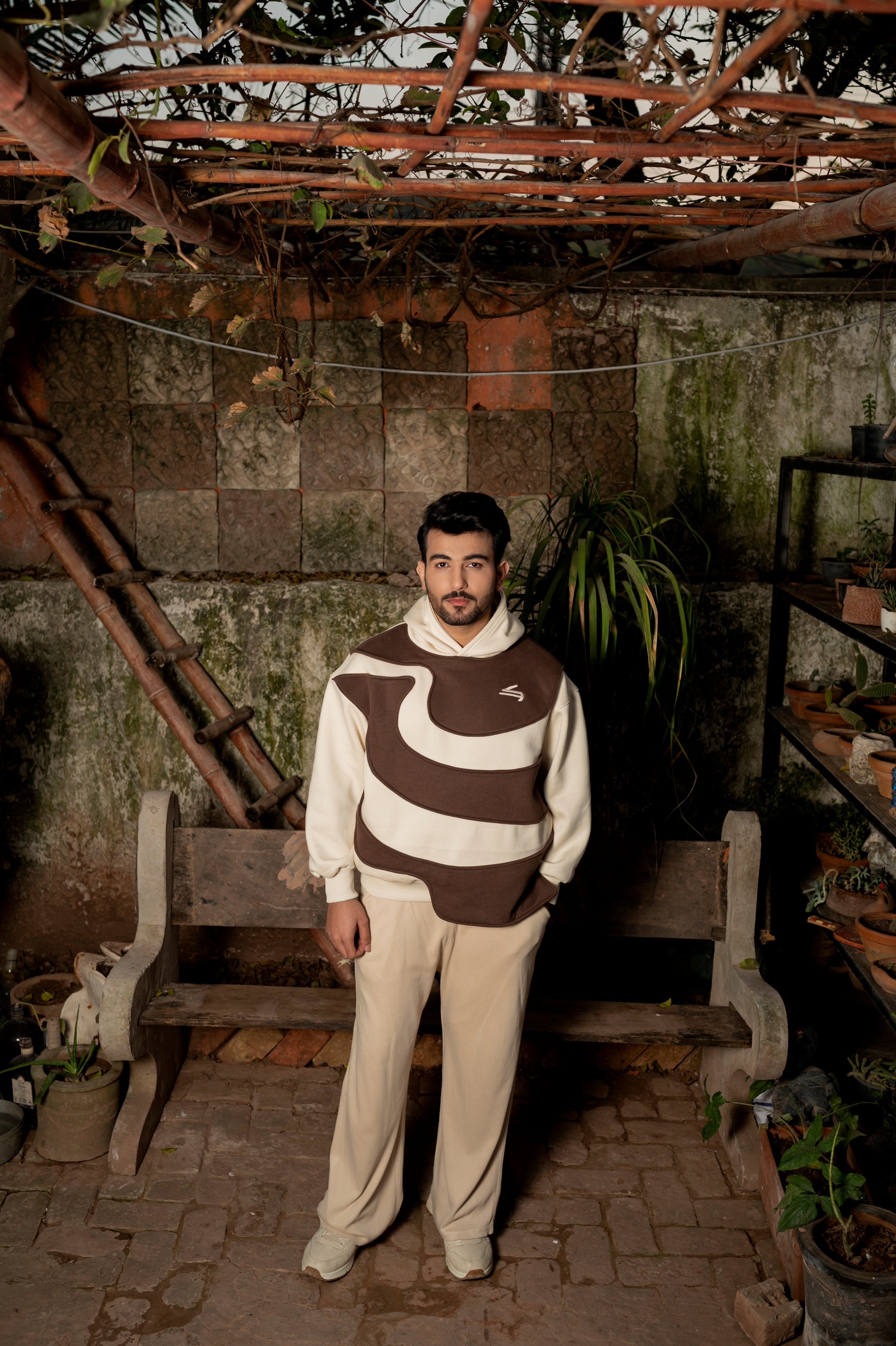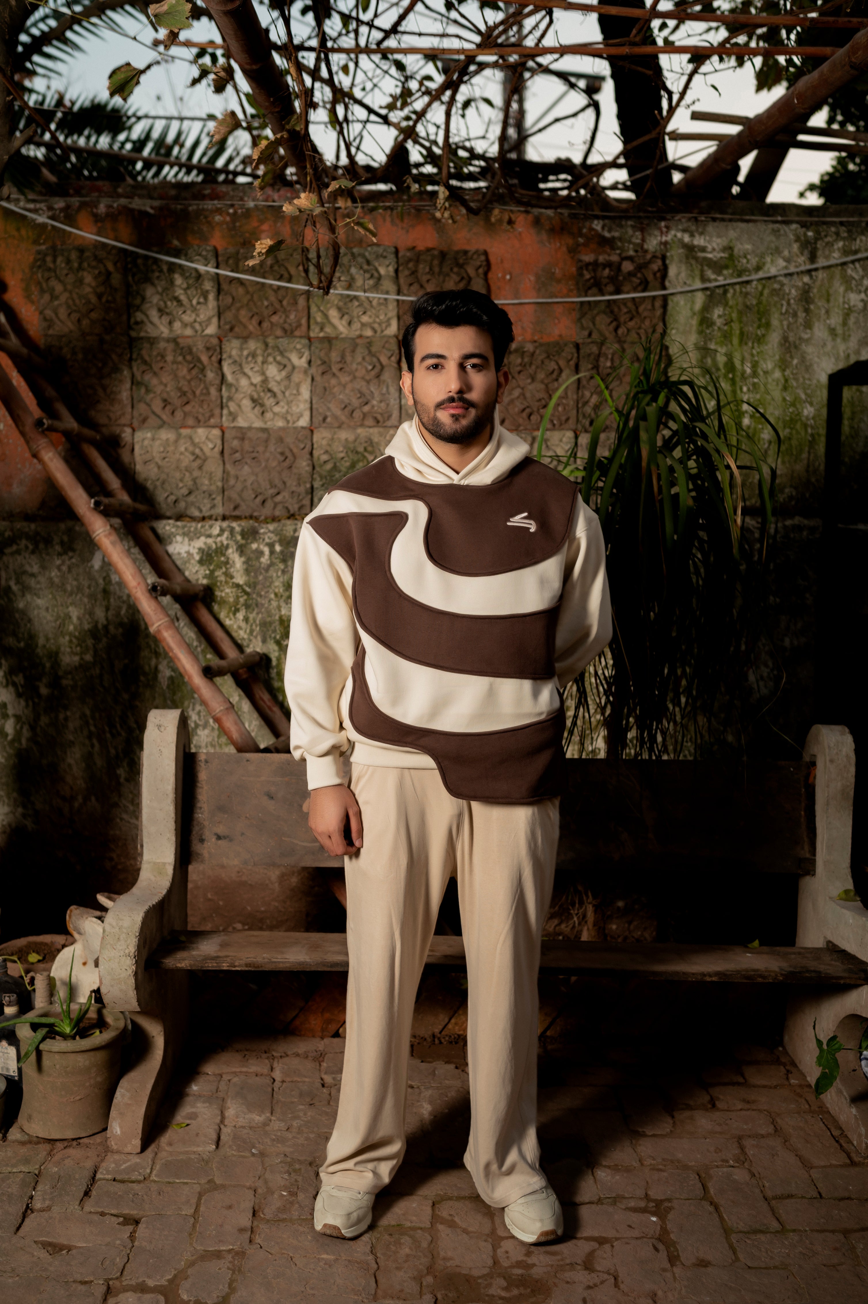 An oversized off-white hoodie designed with unique wave-style paneling in rich brown across the front. Made in premium heavy fleece, it blends subtle earth tones with a bold silhouette, creating a calm yet statement look inspired by desert landscapes and wandering minimalism. Perfect for winter layering and everyday streetwear.