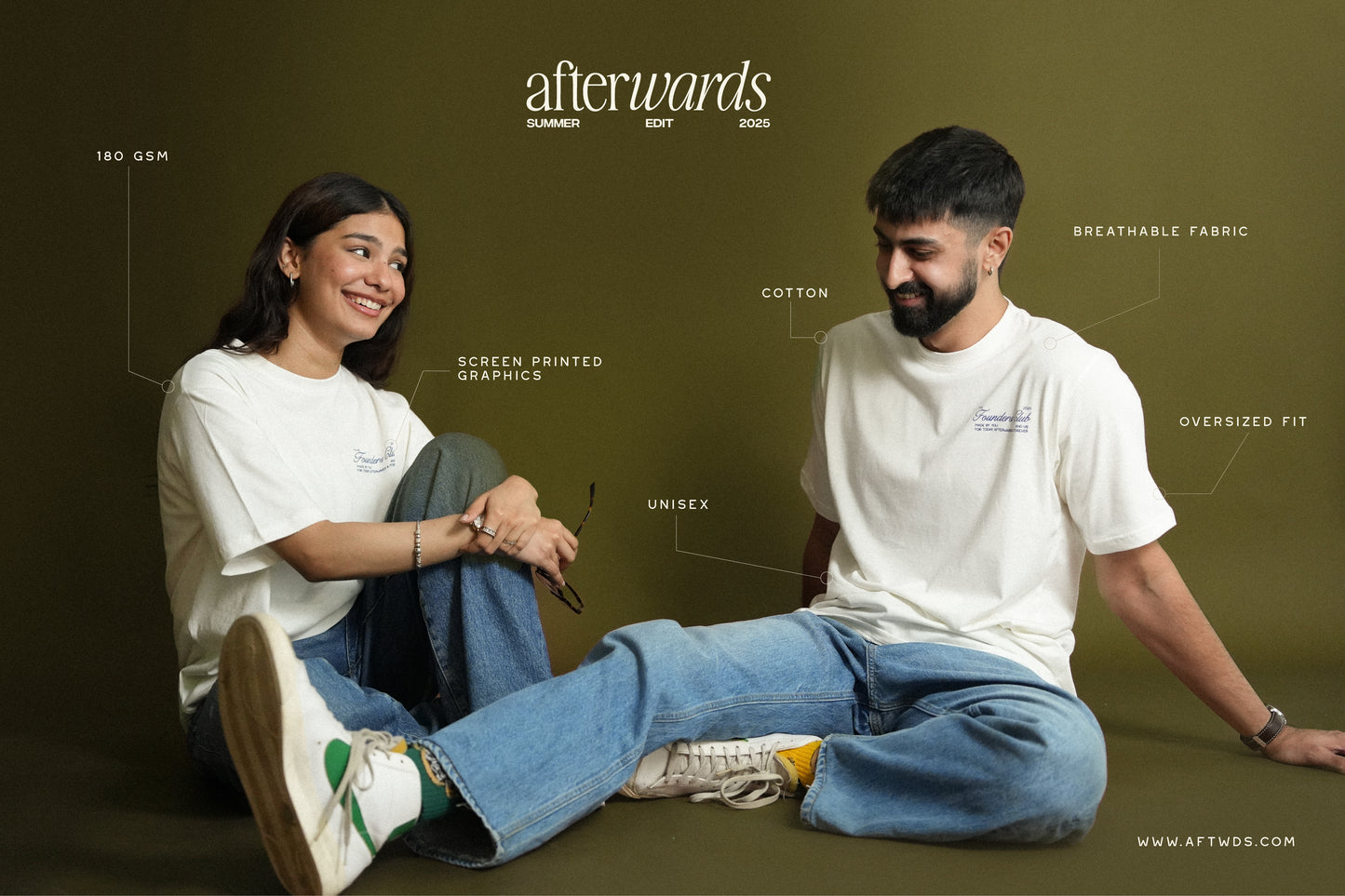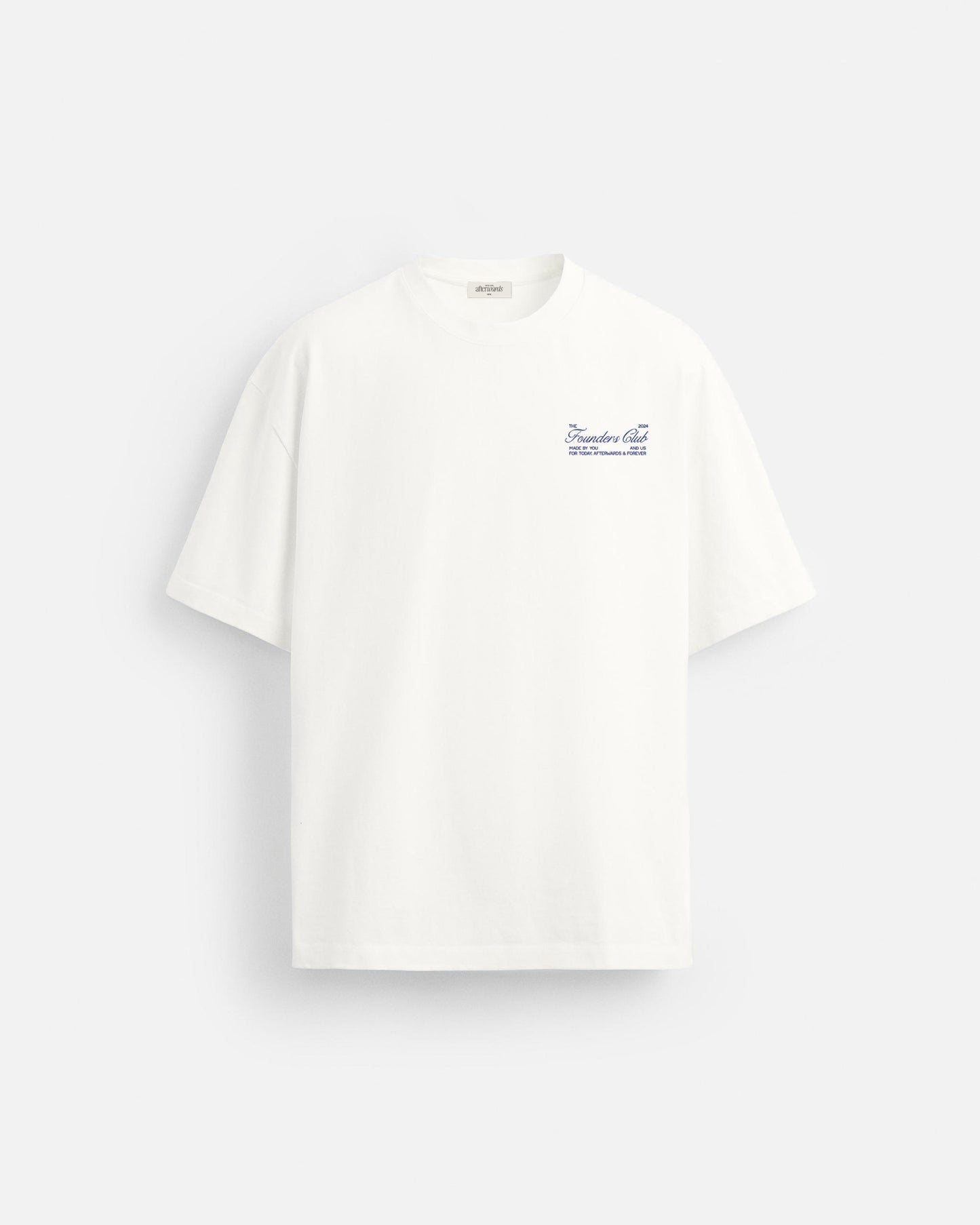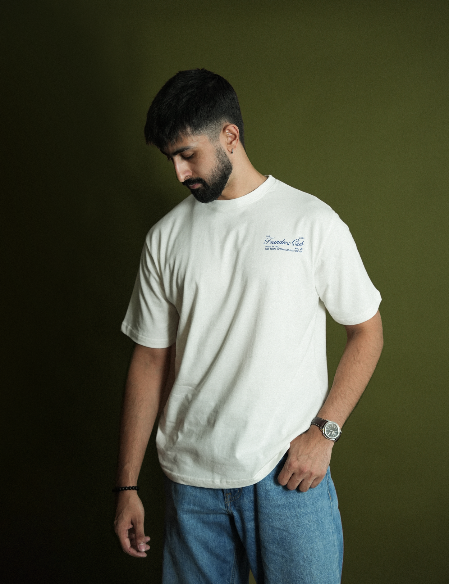+ Oversized T-shirt in an off-white colour + Unisex garment + Front text & back design in 'screen print' technique in navy blue + 170 GSM cotton-blend fabric + Summer-friendly cloth + Oversized fit with drop shoulders + Size chart provided within images