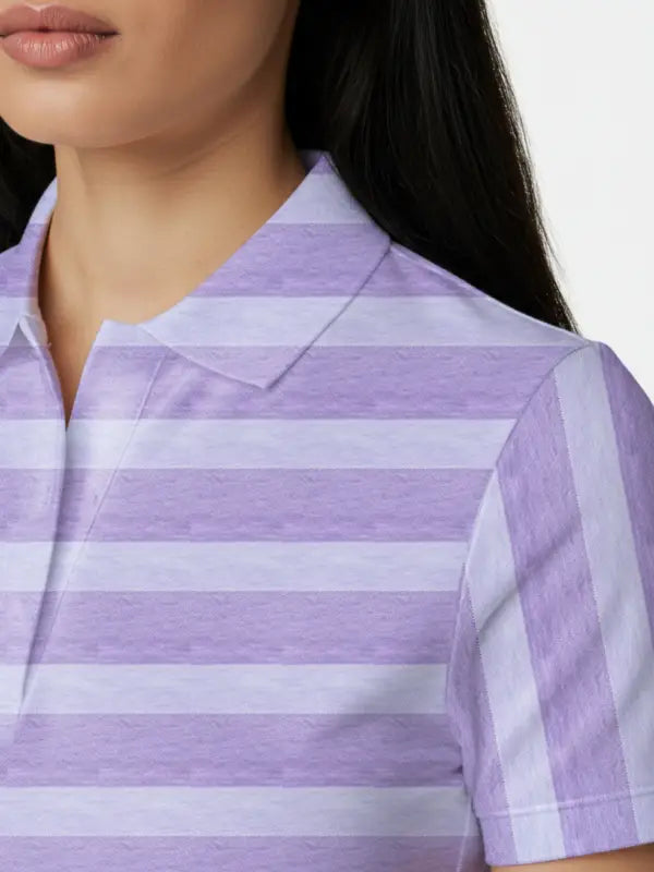 A fresh twist on a classic. This women’s Johnny collar polo features white and light purple tones with strip detailing, short sleeves, and a soft feel made for warm days and easy looks.