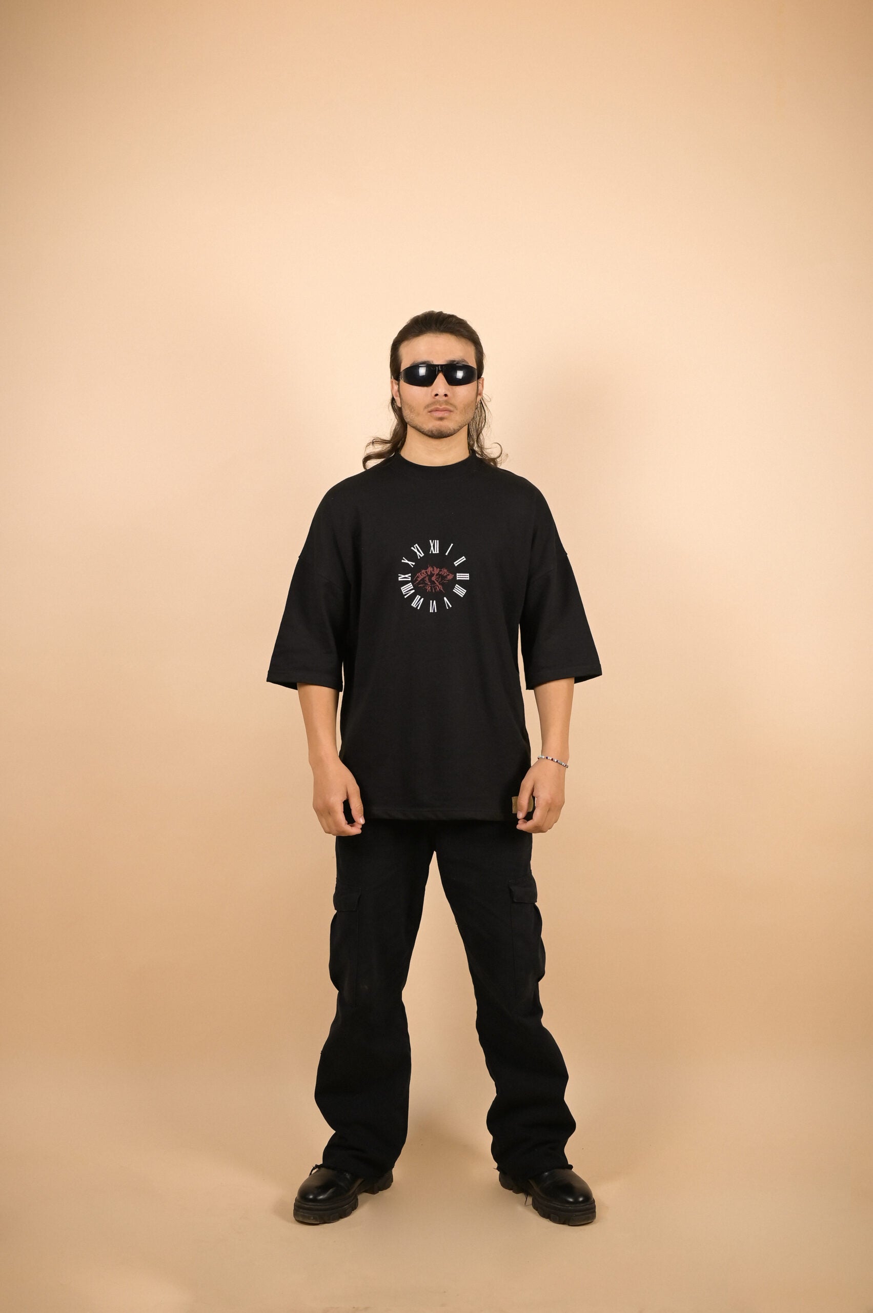 Graphic Elements: CLOCK AND EYE ELMENT ON FRONT (PUFF PRINT) , A BROKEN CLOCK WITH THE SLOGAN ” LOST IN TIME ” ON BACK ( SCREEN PRINT)