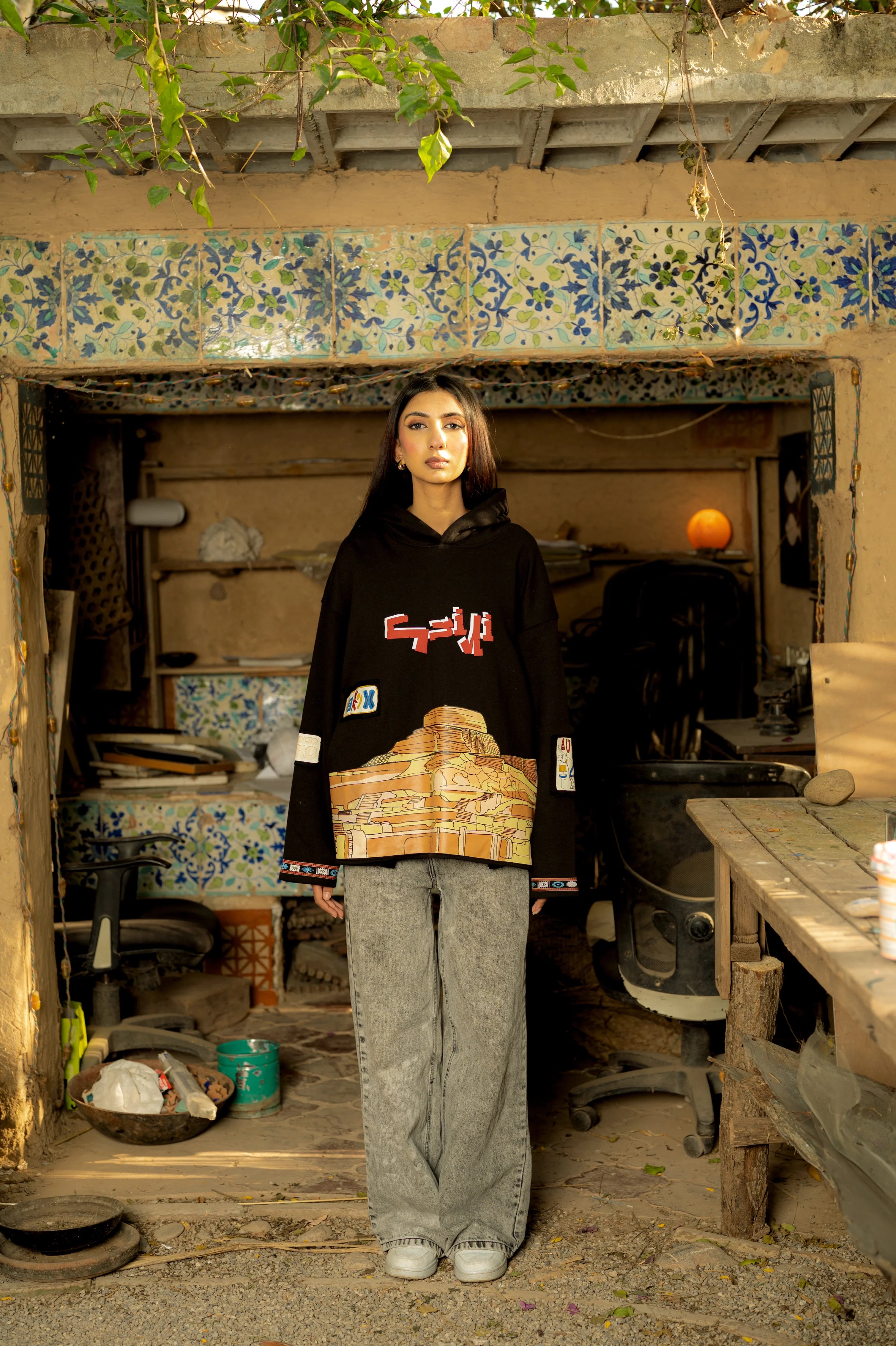 Crafted from soft 100% cotton fleece, this oversized unisex hoodie carries the warmth of history and the comfort of the present. Designed in deep black, it features a puff-printed Urdu logo on the front, reading “ارادے,” which symbolizes strong intentions and resolve.