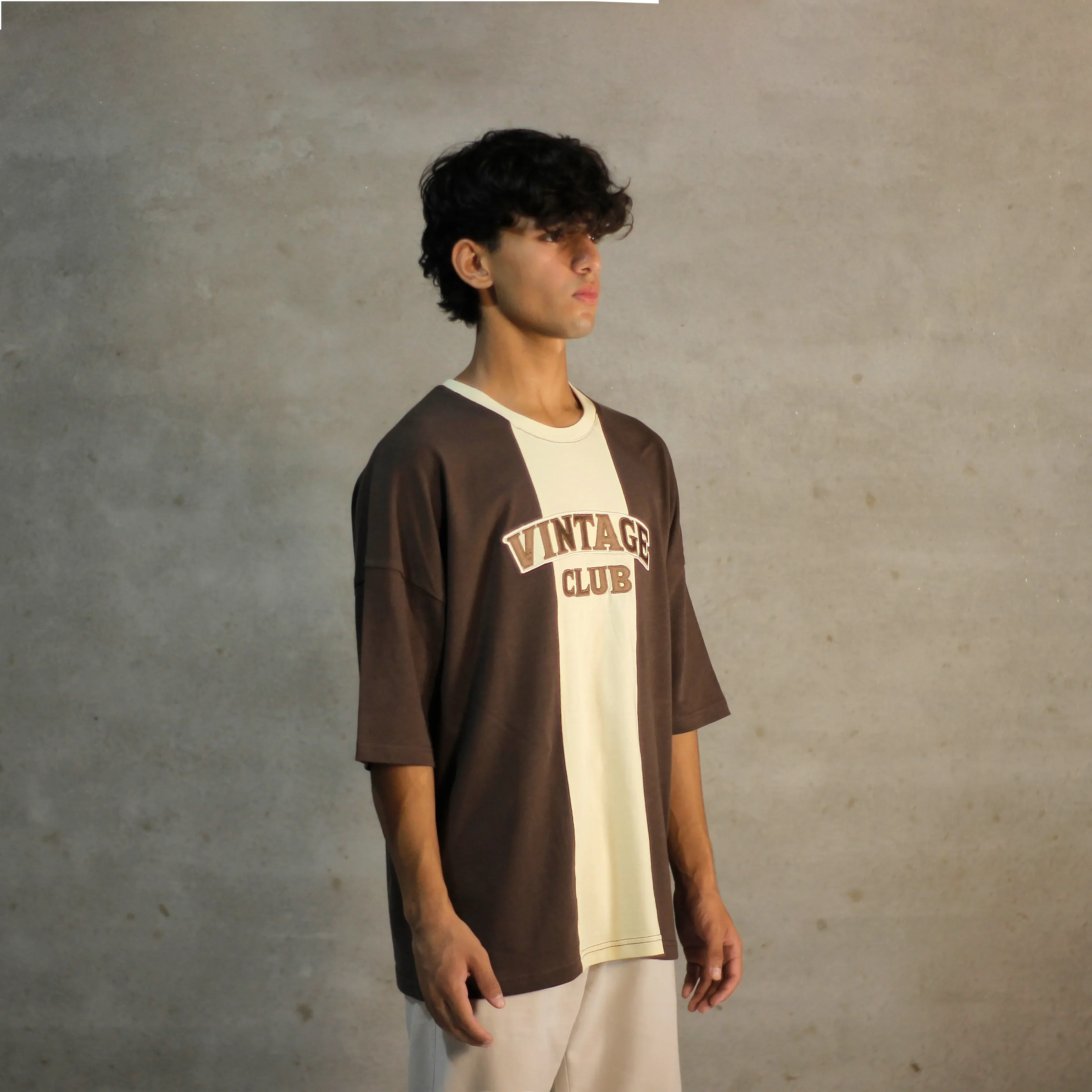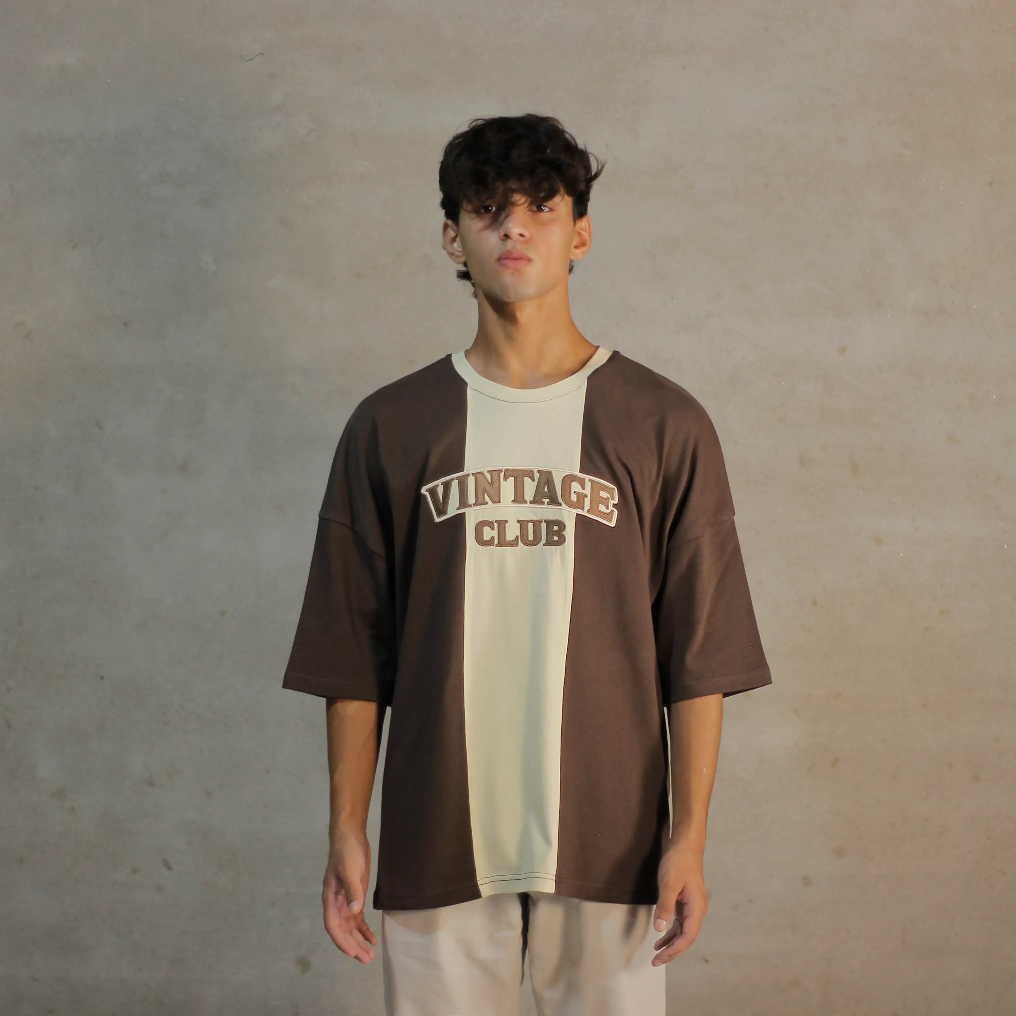 Brown and cream tones meet a throwback split cut, finished with a bold front applique. ‘Oldtown Crew’ brings stitched-in Vintage Club energy, like a hometown classic pulled straight from a 90s varsity rack. Washed look, fresh fit.