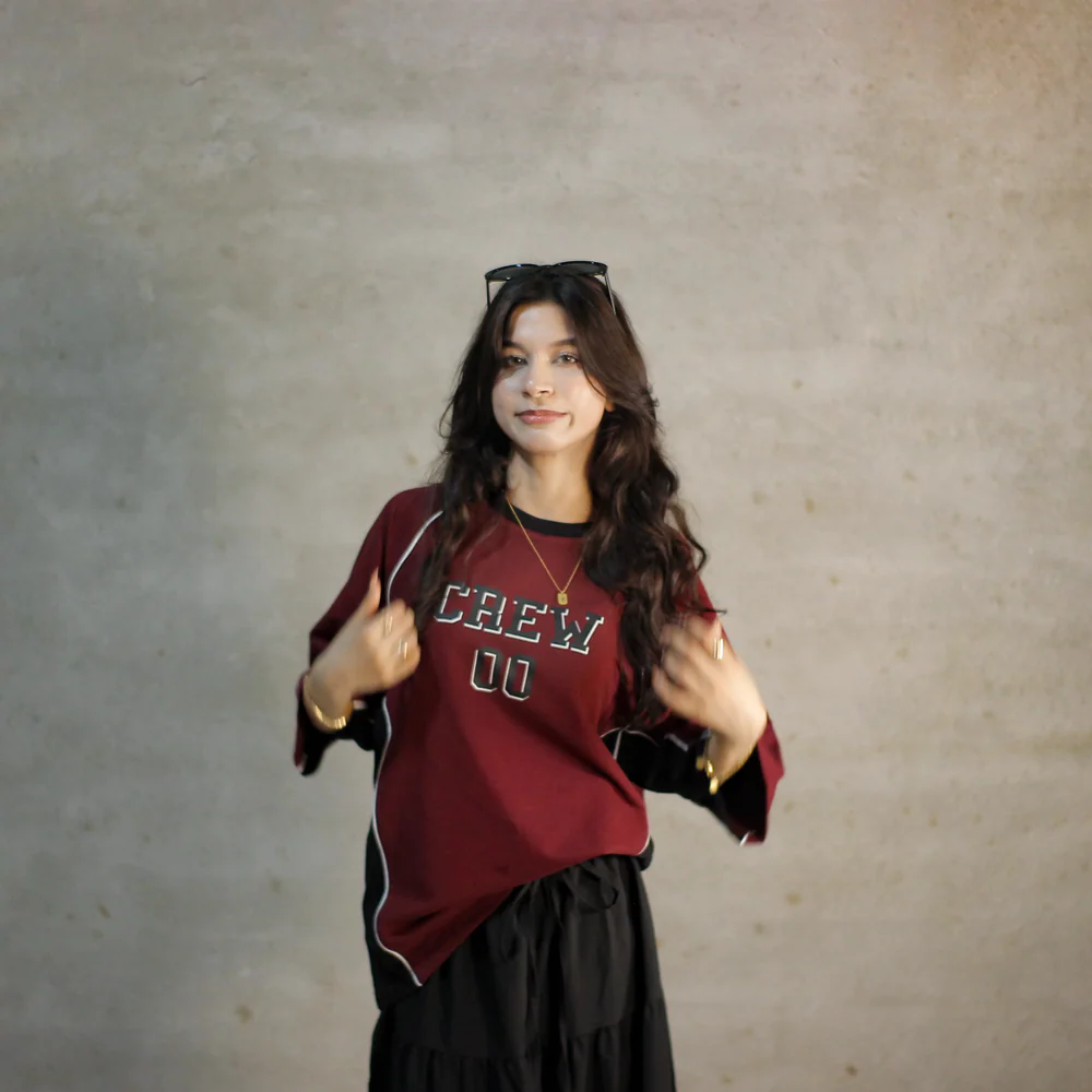 Varsity meets speedwear in this paneled cotton tee. Contrast piping and “CREW 00” hit bring early-2000s track energy. Built for clean structure and standout presence.