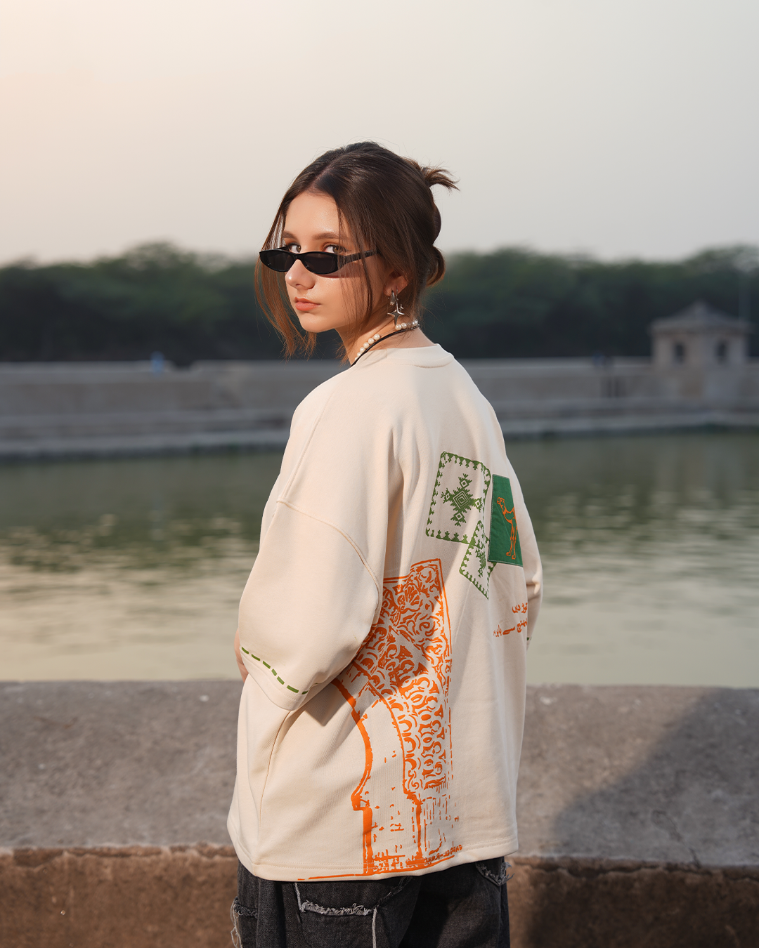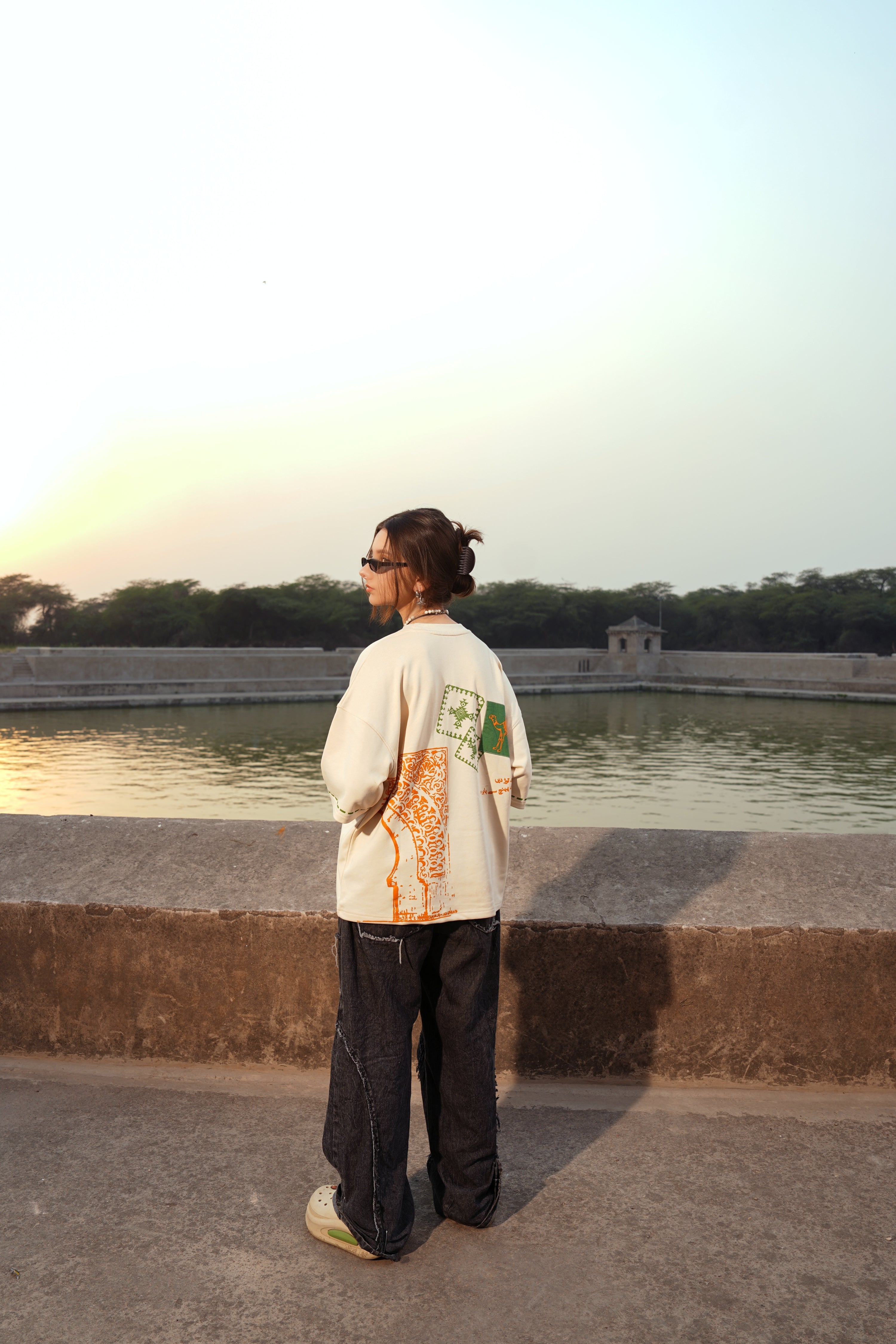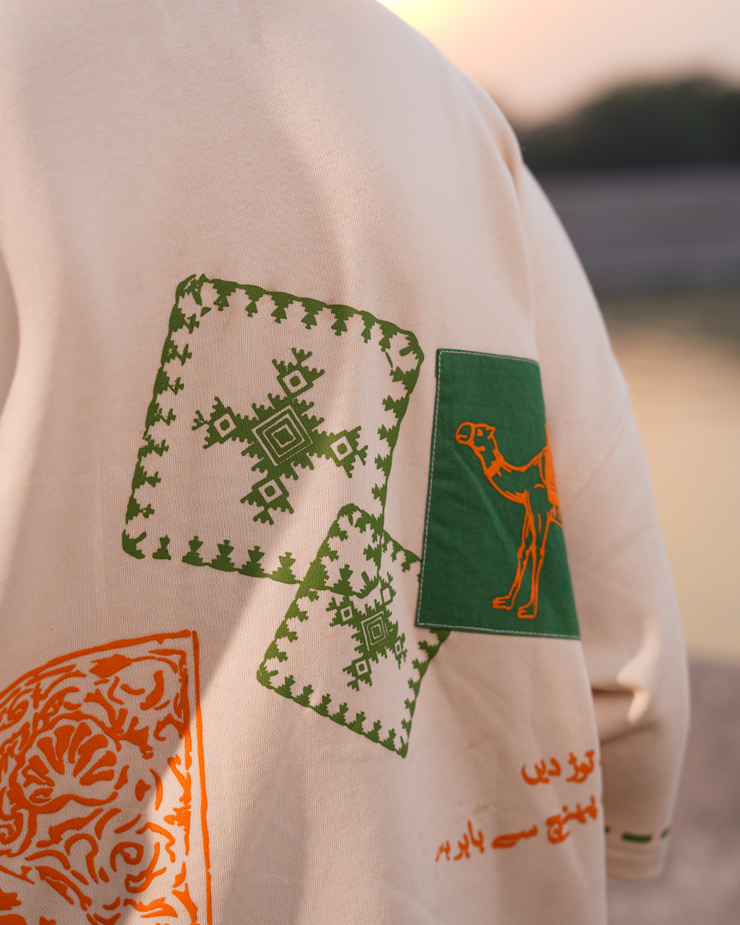 Pull Beyond Reach traces stories of movement through deserts, borders, and time. With cultural stamp motifs, minimal embroidery cues, and the timeless camel as a symbol of endurance, this piece is a wearable postcard from nowhere and everywhere.