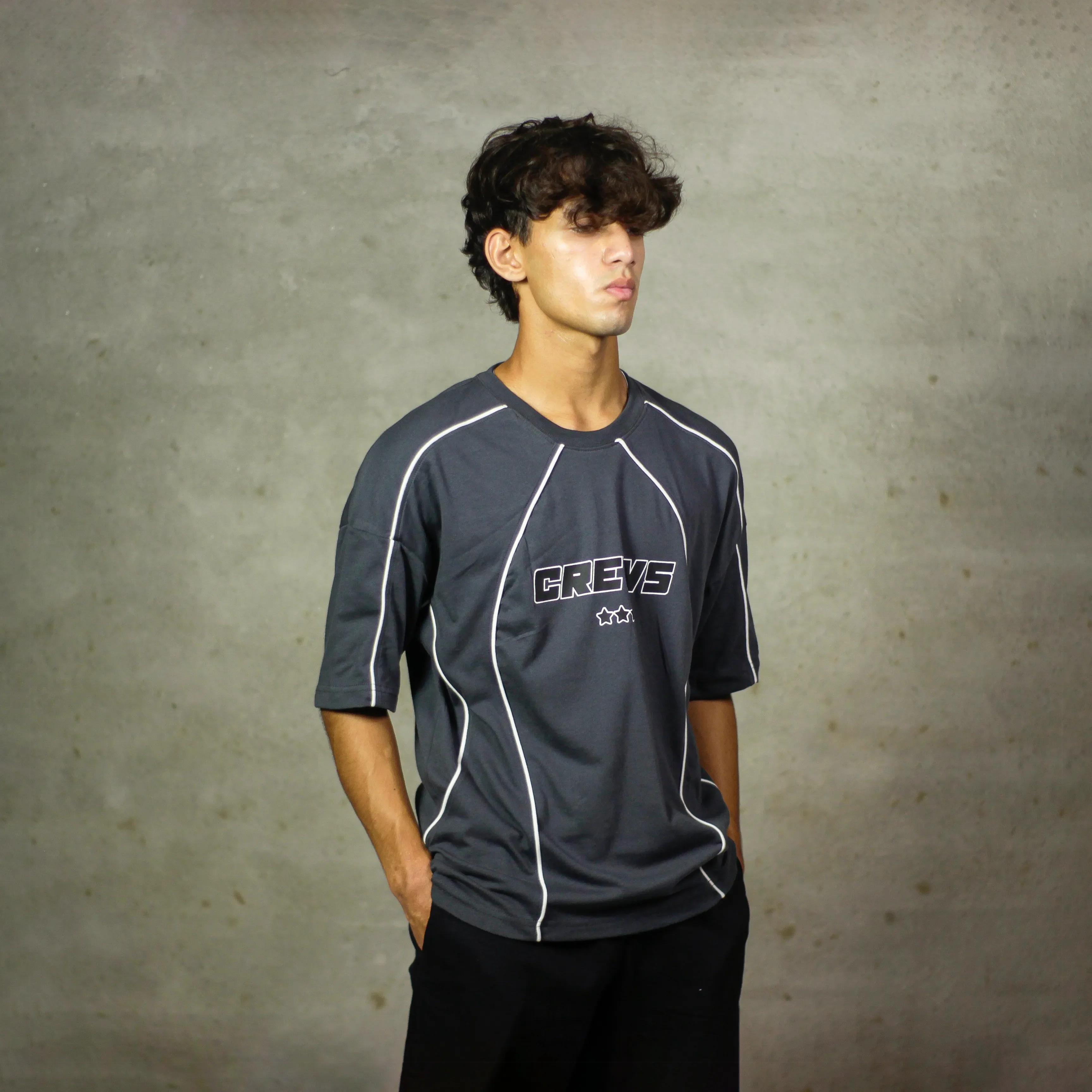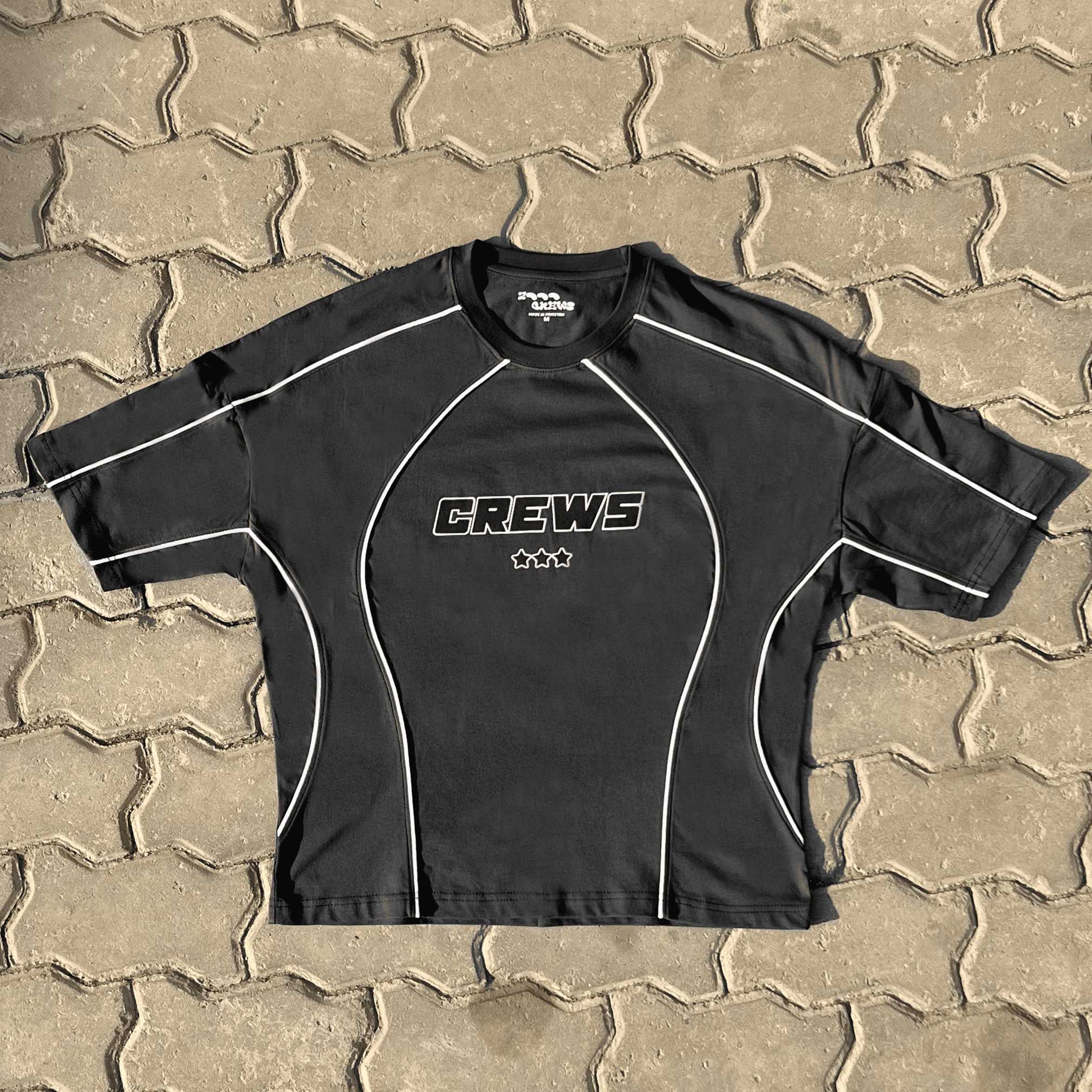 A fusion of streetwear and techwear, this tee features contrast piping that highlights its structured paneling. The bold "CREWS" branding and triple-star emblem add an athletic edge, making it a statement piece for any urban wardrobe.