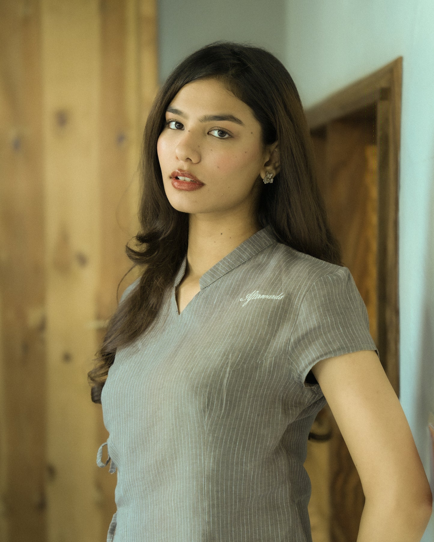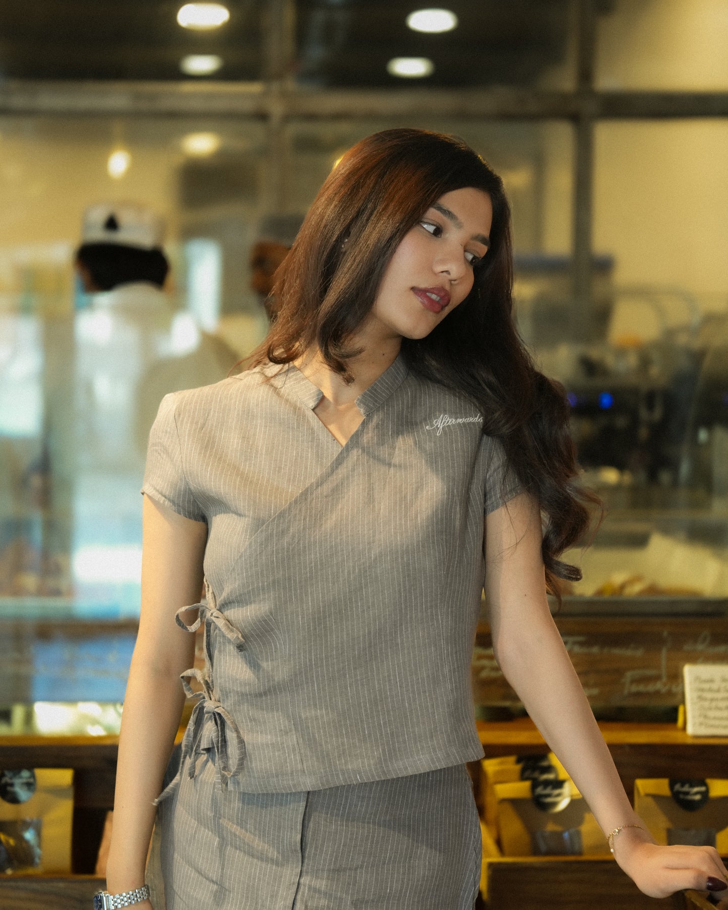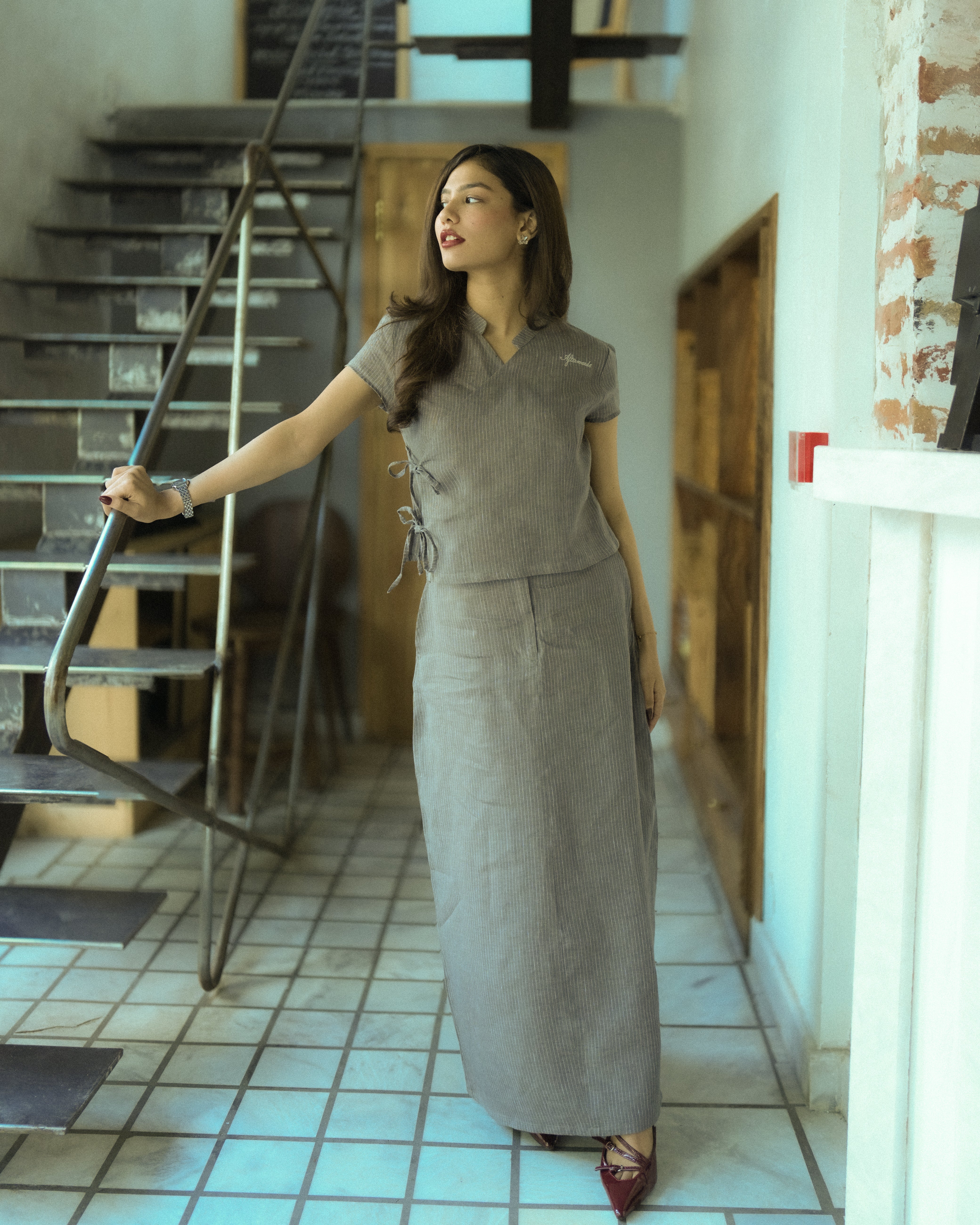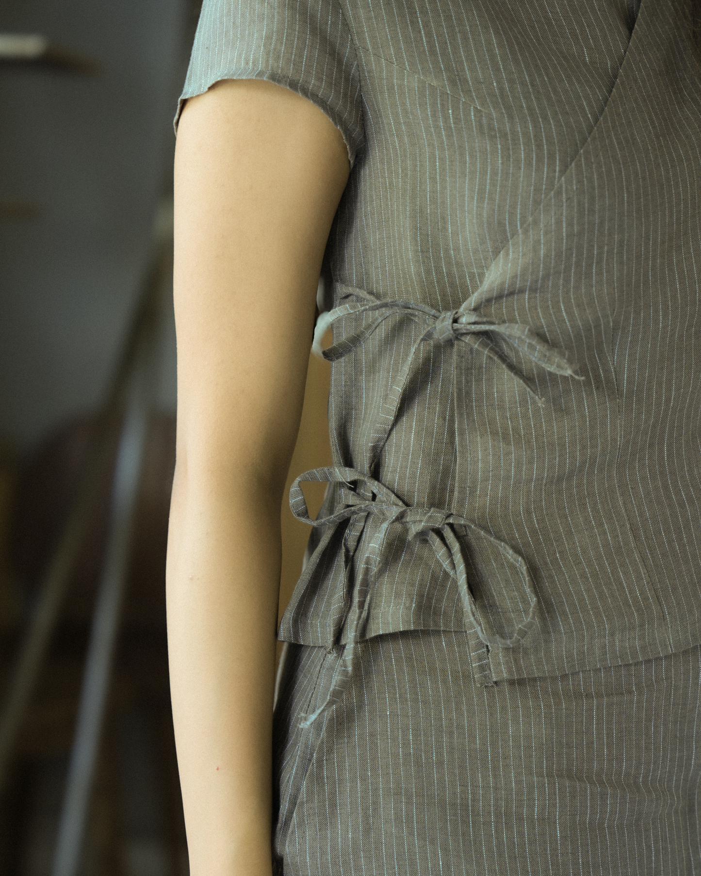 A two-piece set of skirt & kimono style top + Material: pinstripe linen fabric with wool blend + Top is adjustable from the chest to torso area with string mechanism on the side + Skirt waistband is secured with a hook & zip with elastic on the back for up to 2 inches of stretch + Skirt has a back slit to provide ease in movement + Skirt has medium depth pockets